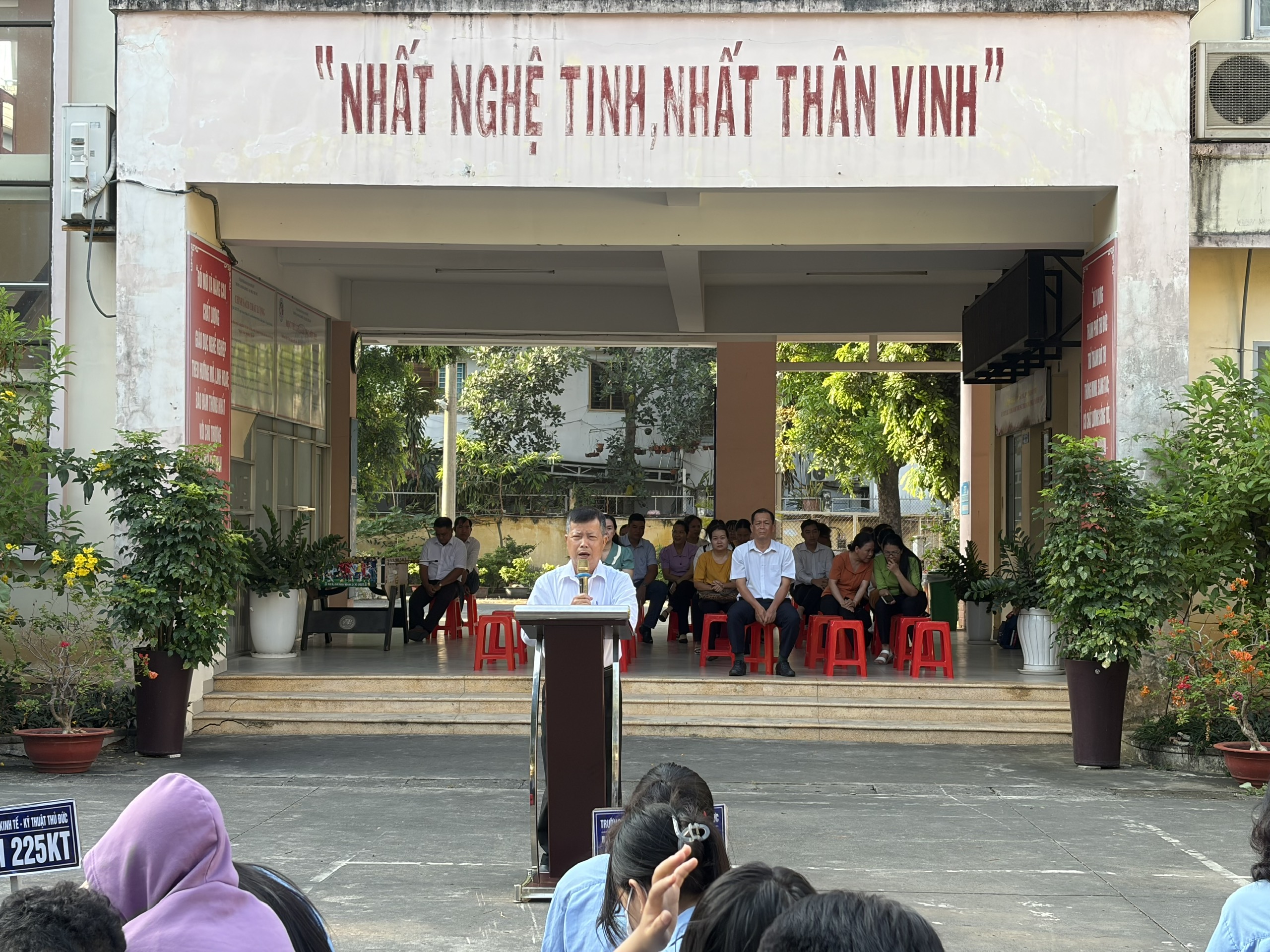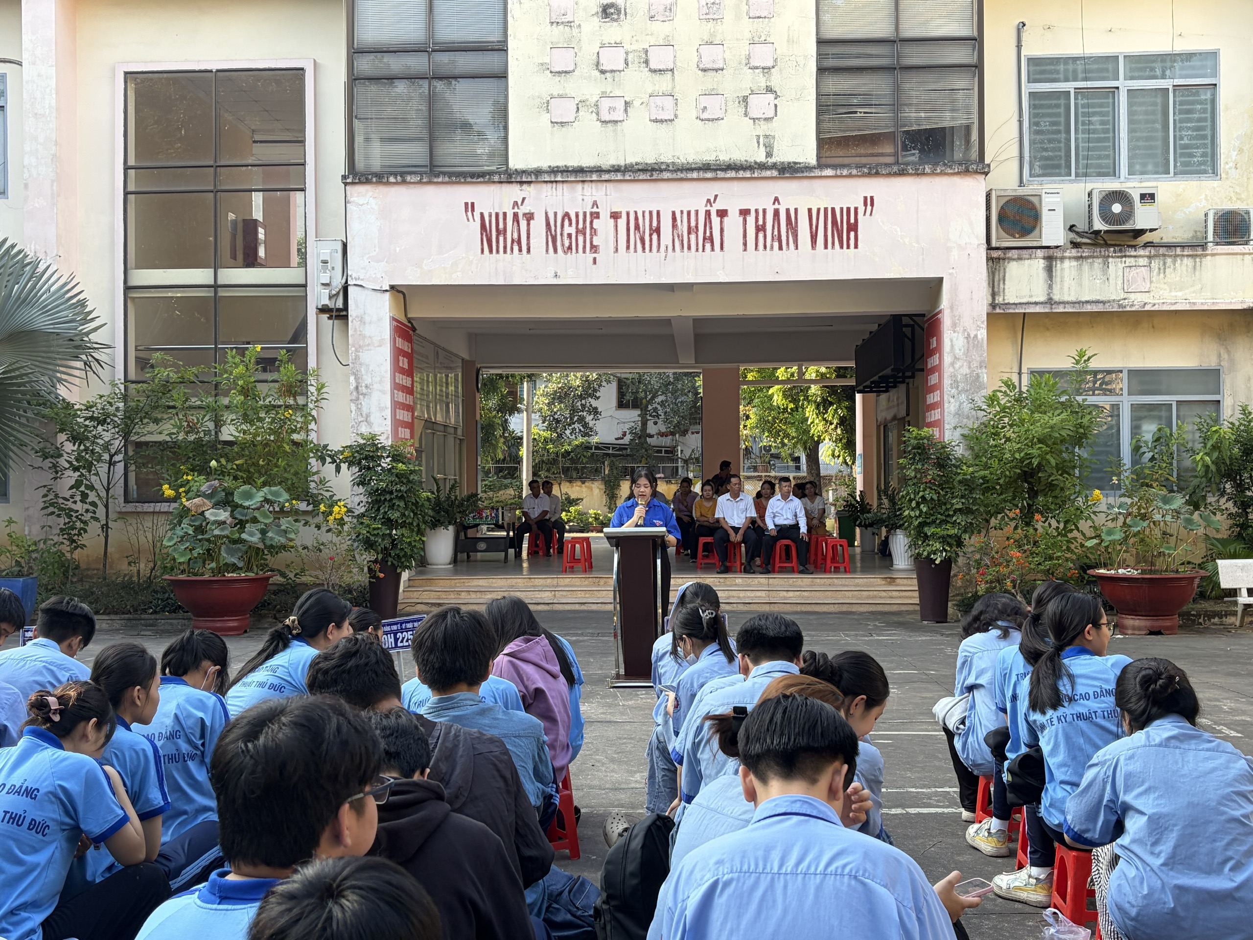 Sáng ngày 06/04/2026, Trường Cao đẳng Kinh tế – Kỹ thuật Thủ Đức đã tổ chức lễ chào cờ định kỳ trong không khí nghiêm trang, nề nếp với sự tham dự của toàn thể cán bộ, giảng viên và sinh viên nhà trường. Buổi lễ không chỉ là hoạt động thường kỳ mà còn mang ý nghĩa giáo dục chính trị, tư tưởng và tinh thần trách nhiệm cho sinh viên.