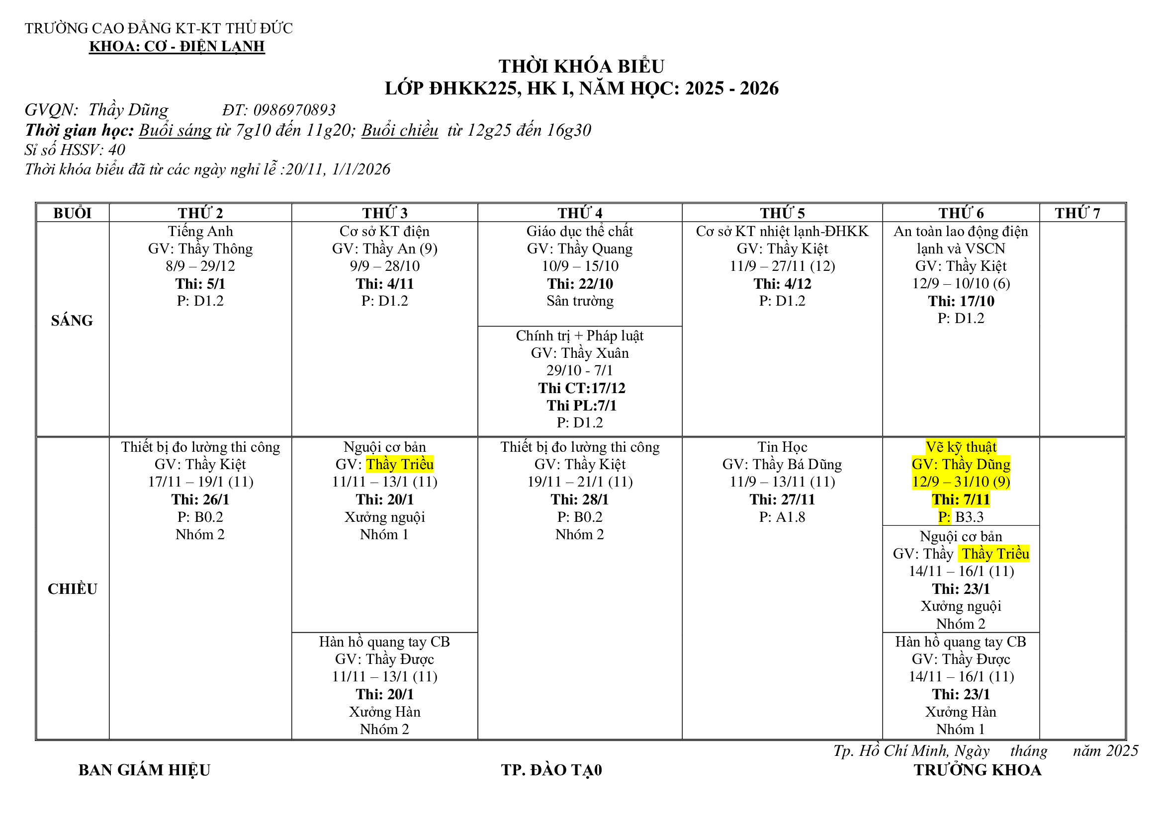 THỜI KHÓA BIỂU LỚP ĐHKK225, HK I, NĂM HỌC: 2025 - 2026